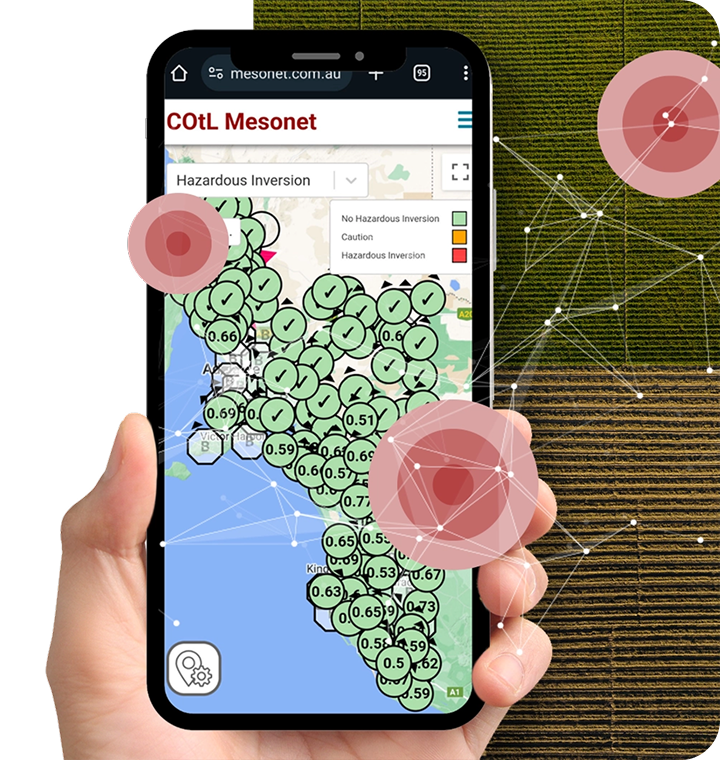 Backed by BoM-equivalent standards for atmospheric data accuracy and instrumentation quality, the Mesonet network is South Australia’s only hazardous inversion alert system, helping farmers: